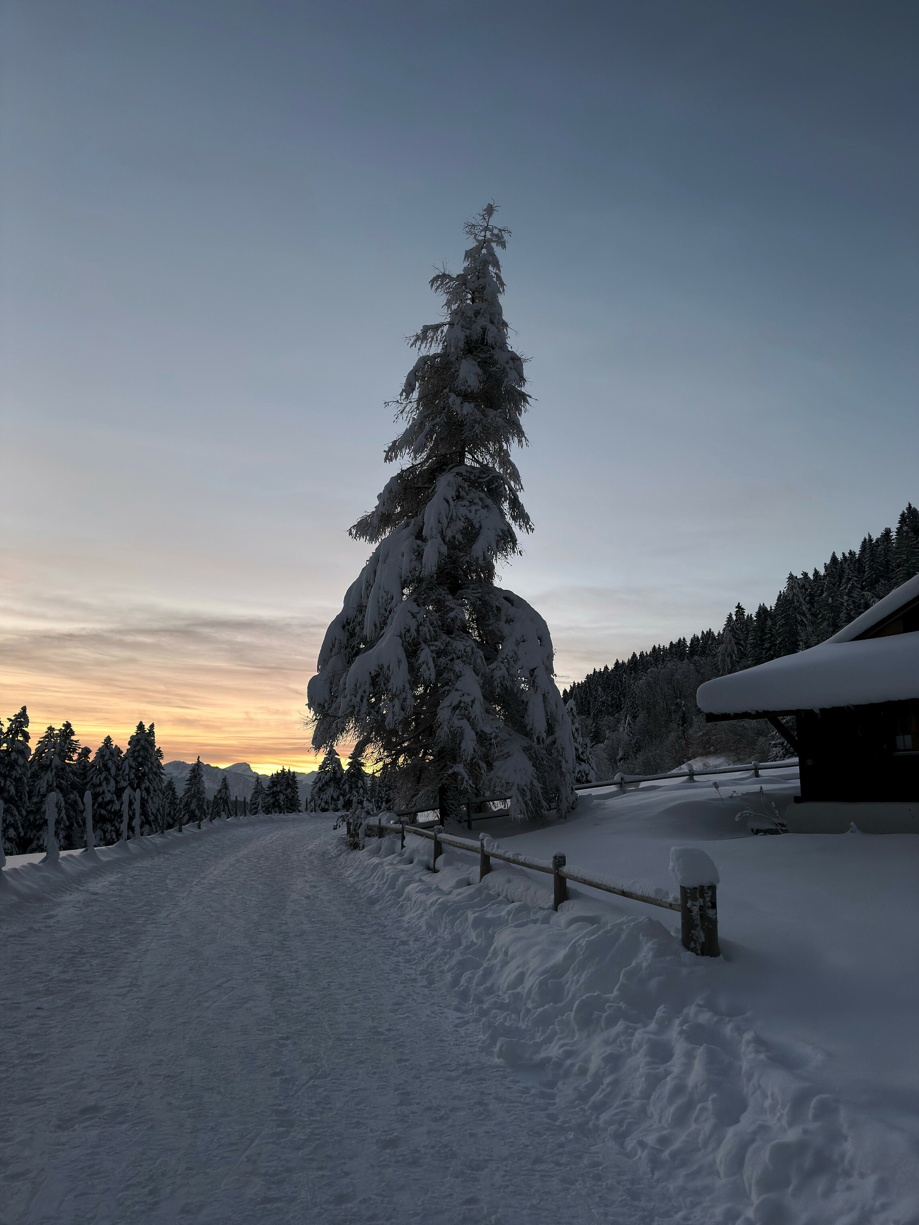 Snow‑laden tree catching the last colors of sunset
