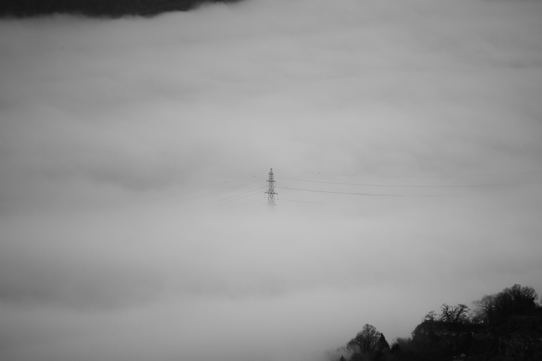 The high-voltage line rises above the mist